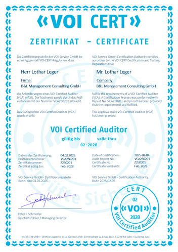 VOI-CERT benennt und zertifiziert fachlich qualifizierte Auditoren, die Zertifizierungen nach den anerkannten VOI-CERT-Programmen vornehmen.